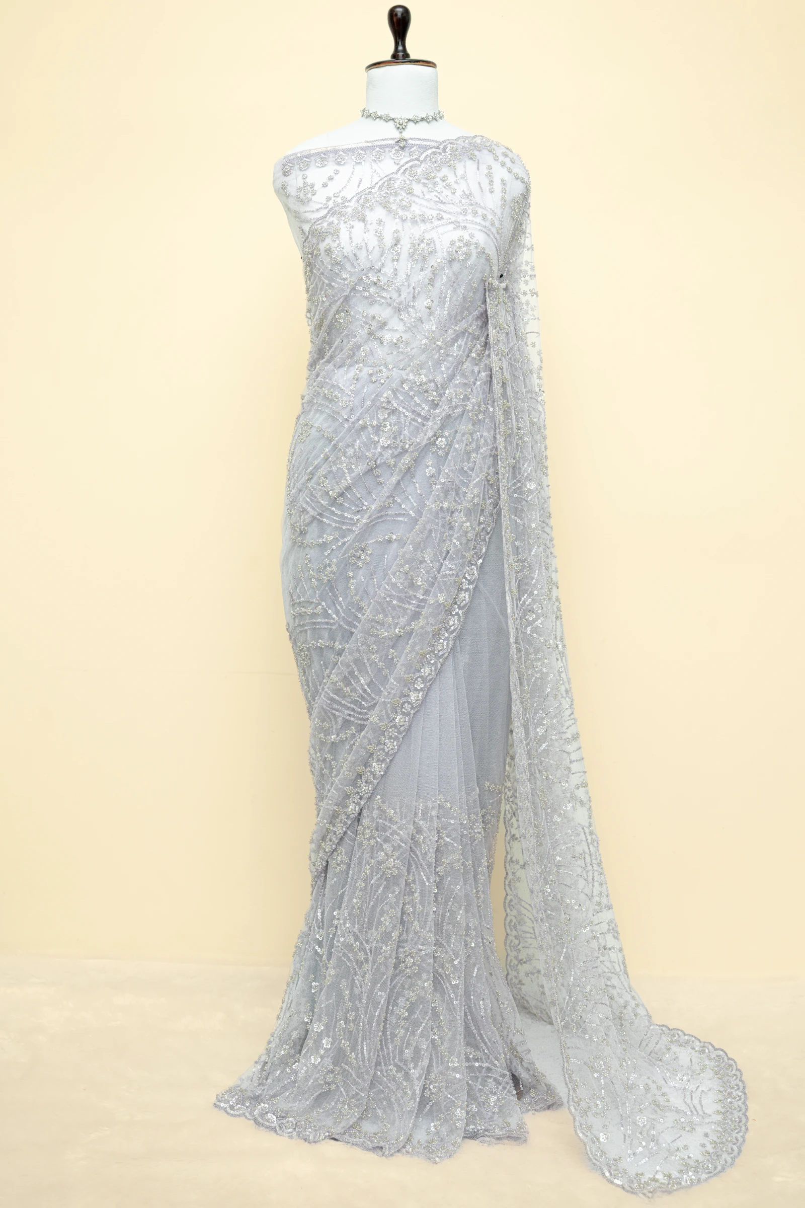 Powder Blue Net Aari Work Hand-Embroidered Saree with Sequins & Cutdana