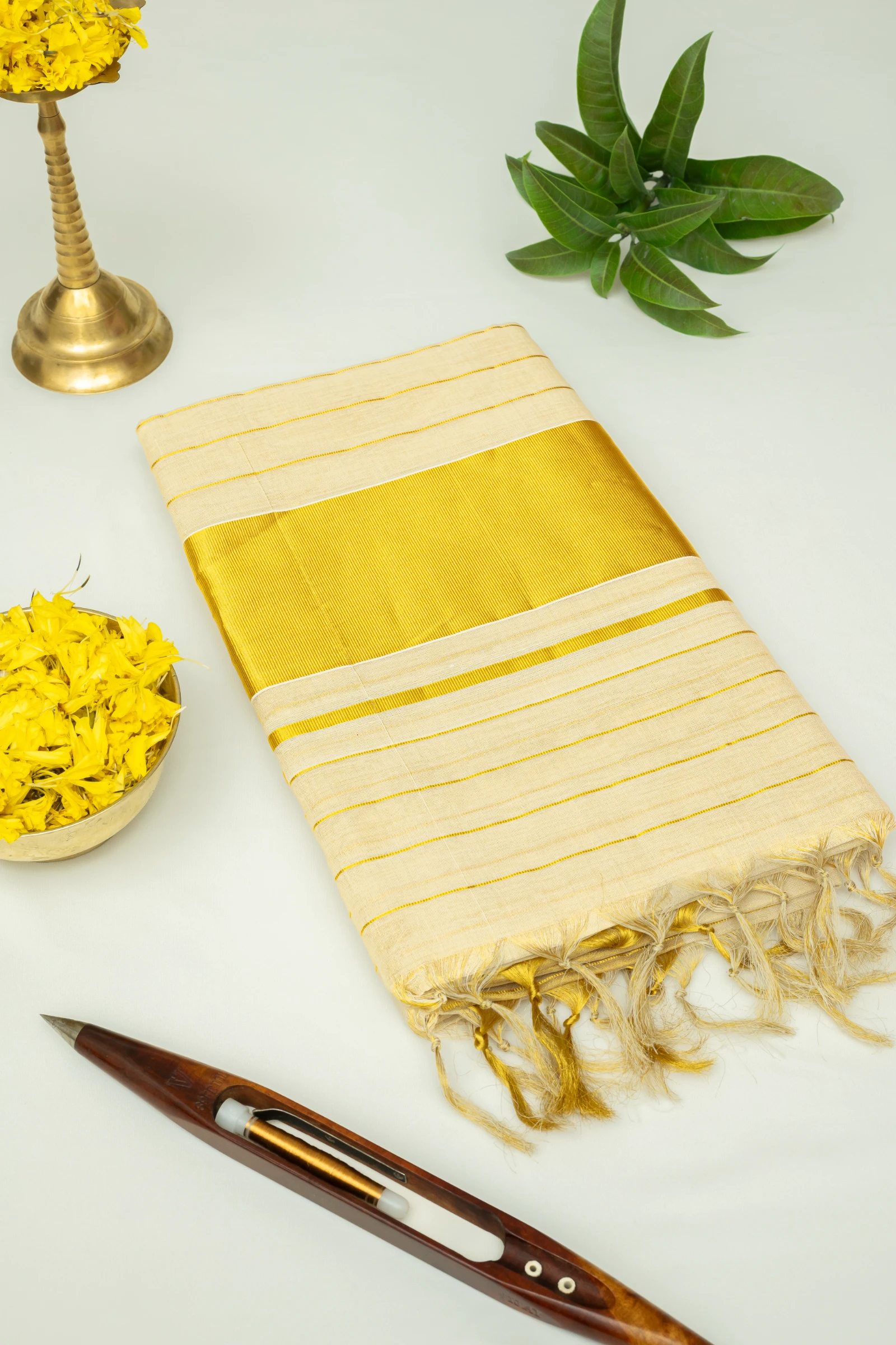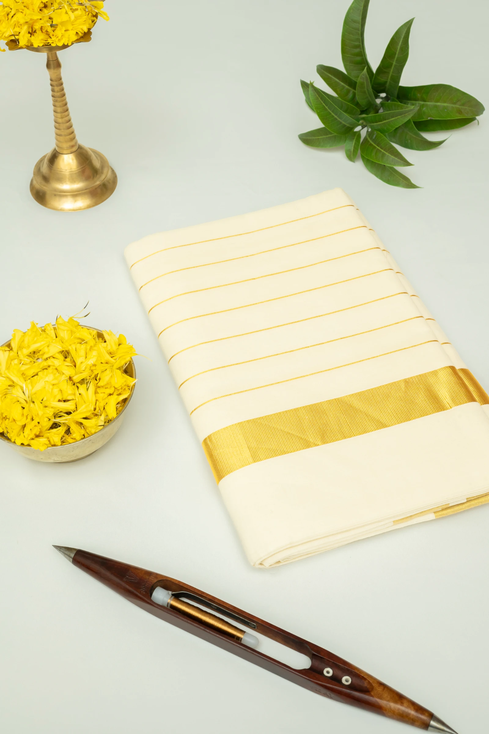 Off-White Pure Handloom Hand-Spun Kerala Kasavu Tissue Saree with Zari Stripes & Traditional Zari Border