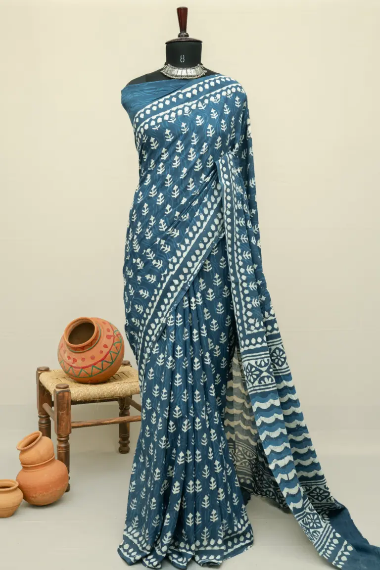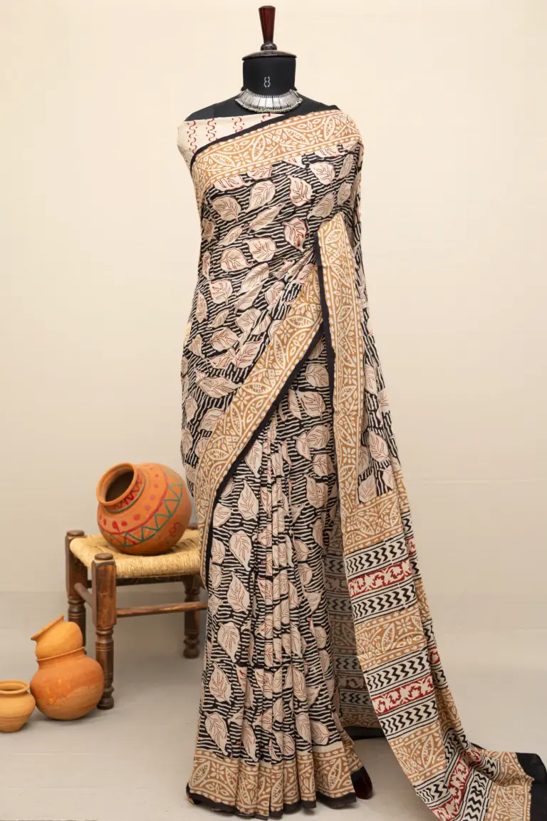 Crafted using the traditional Ajrakh hand block printing technique, this saree is dyed with natural vanaspati dyes, following a 4,500-year-old resist-dyeing tradition.