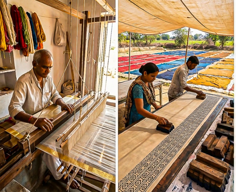 Natural Dye Block Printing: In Rajasthan and Gujarat, artisans use age-old block printing techniques like Ajrakh and Bagru. Natural vanaspati dyes require 15–20 days of careful processing, but the result is skin-friendly, eco-conscious authenticity.