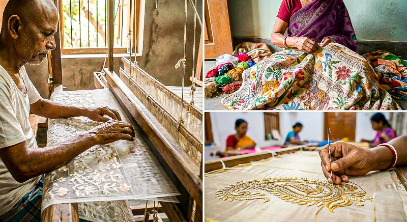 Aari Hand Embroidery: Near Kolkata, traditional Aari work is still done by hand — taking days or even months depending on complexity — preserving techniques passed down through generations.
