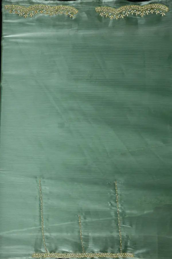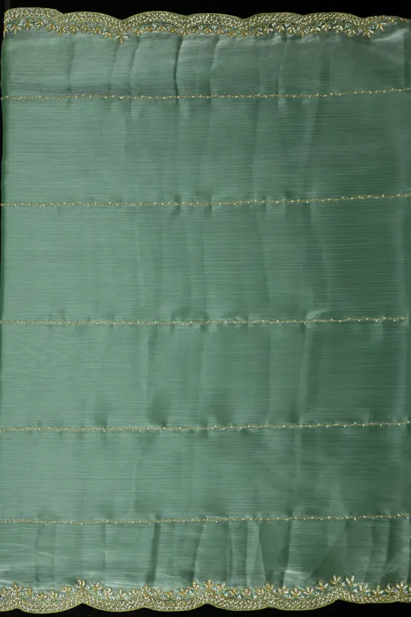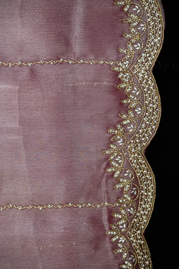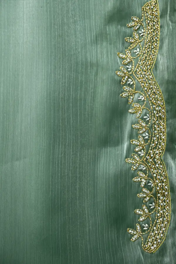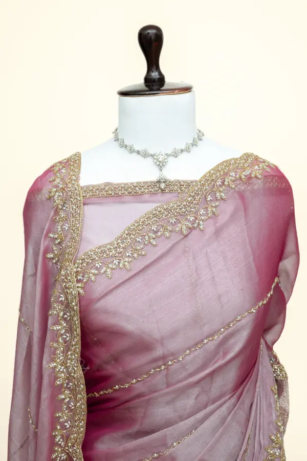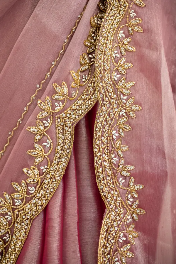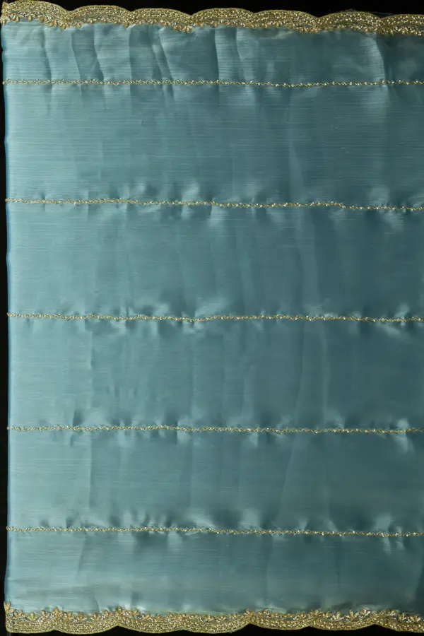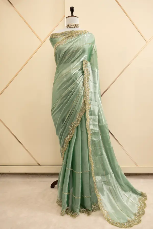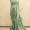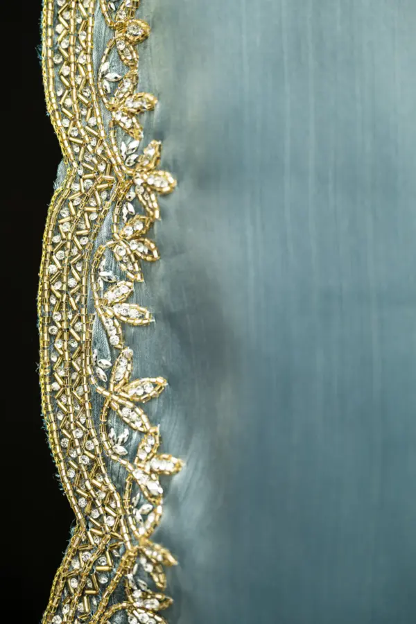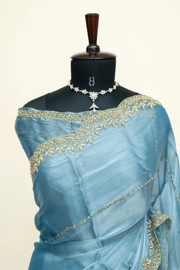 Craft Story: Rooted in Mughal heritage, Aari work is a centuries old hand embroidery technique executed with a hooked needle to form intricate chain stitches. Once reserved for royal garments of the Mughal Empire, it endures today as a timeless expression of artisanal legacy and refined luxury. Specifications: Saree Fabric Jimmy Choo Saree Colour Firozi […]