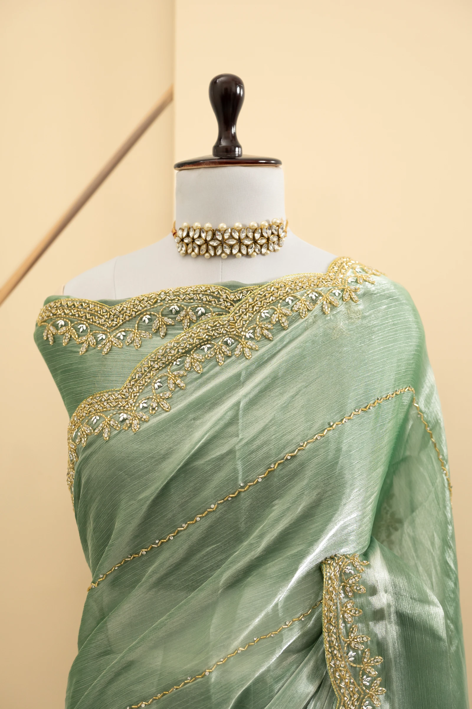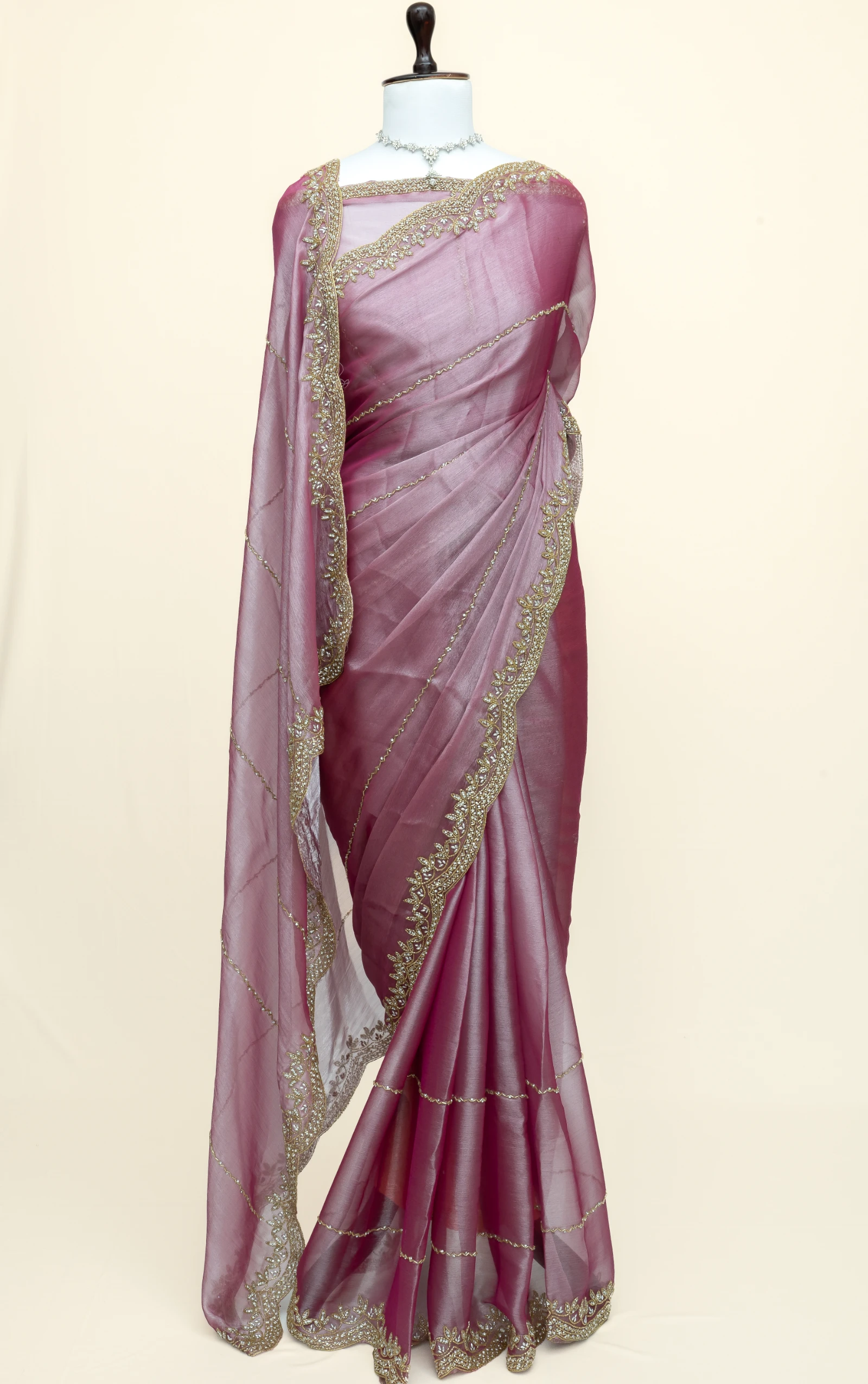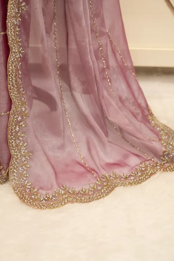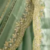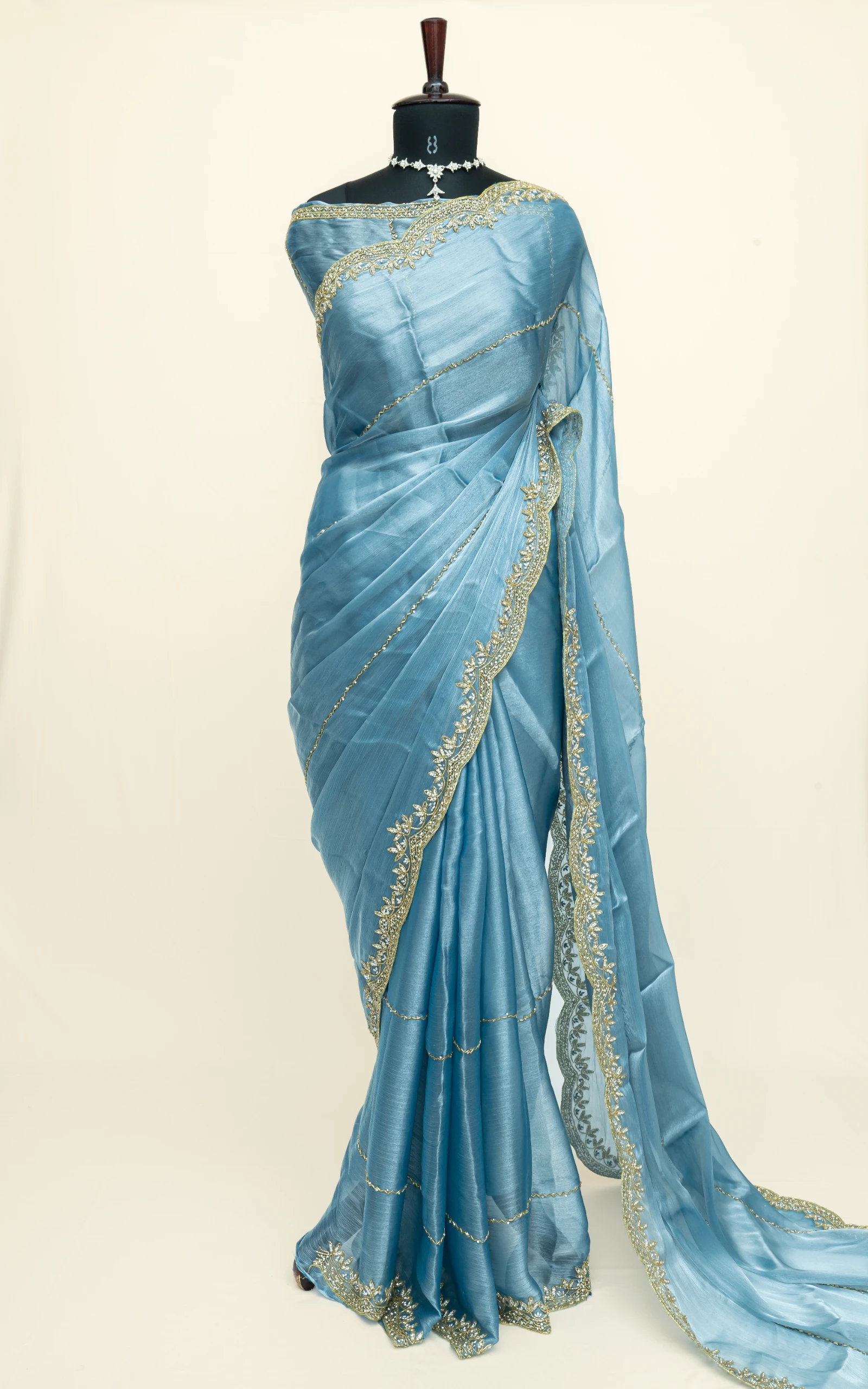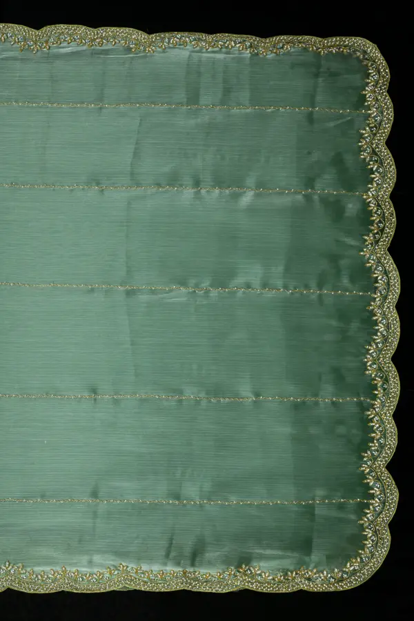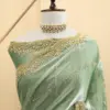 Craft Story: Rooted in Mughal heritage, Aari work is a centuries old hand embroidery technique executed with a hooked needle to form intricate chain stitches. Once reserved for royal garments of the Mughal Empire, it endures today as a timeless expression of artisanal legacy and refined luxury. Specifications: Saree Fabric Jimmy Choo Saree Colour Firozi […]