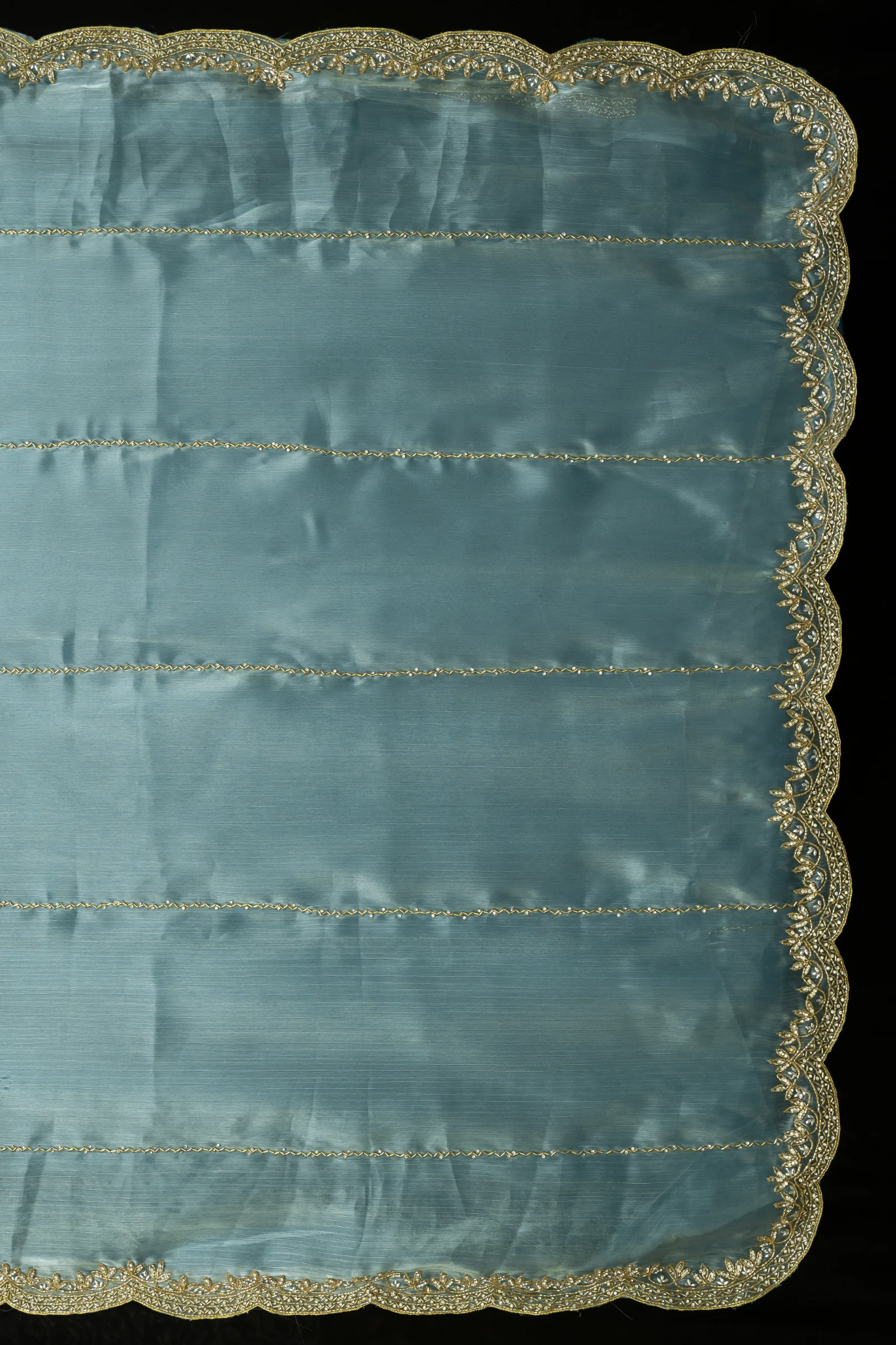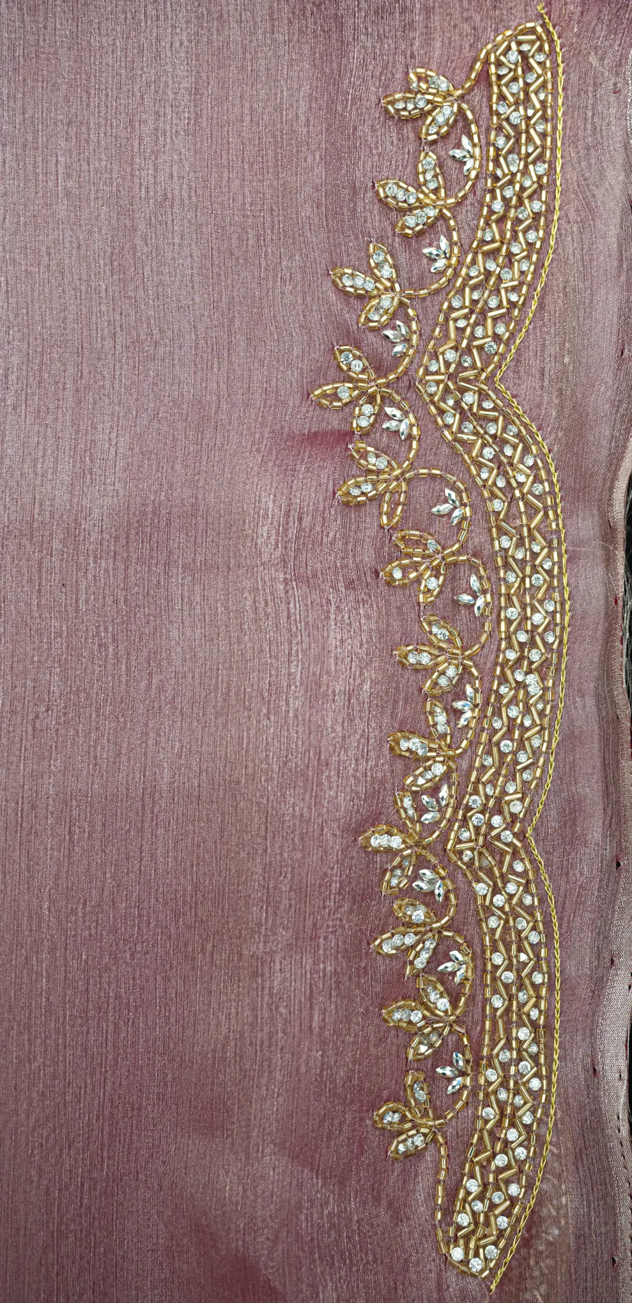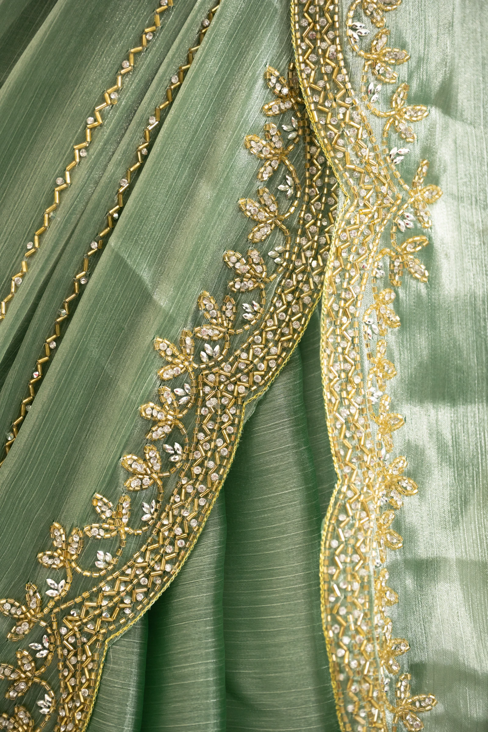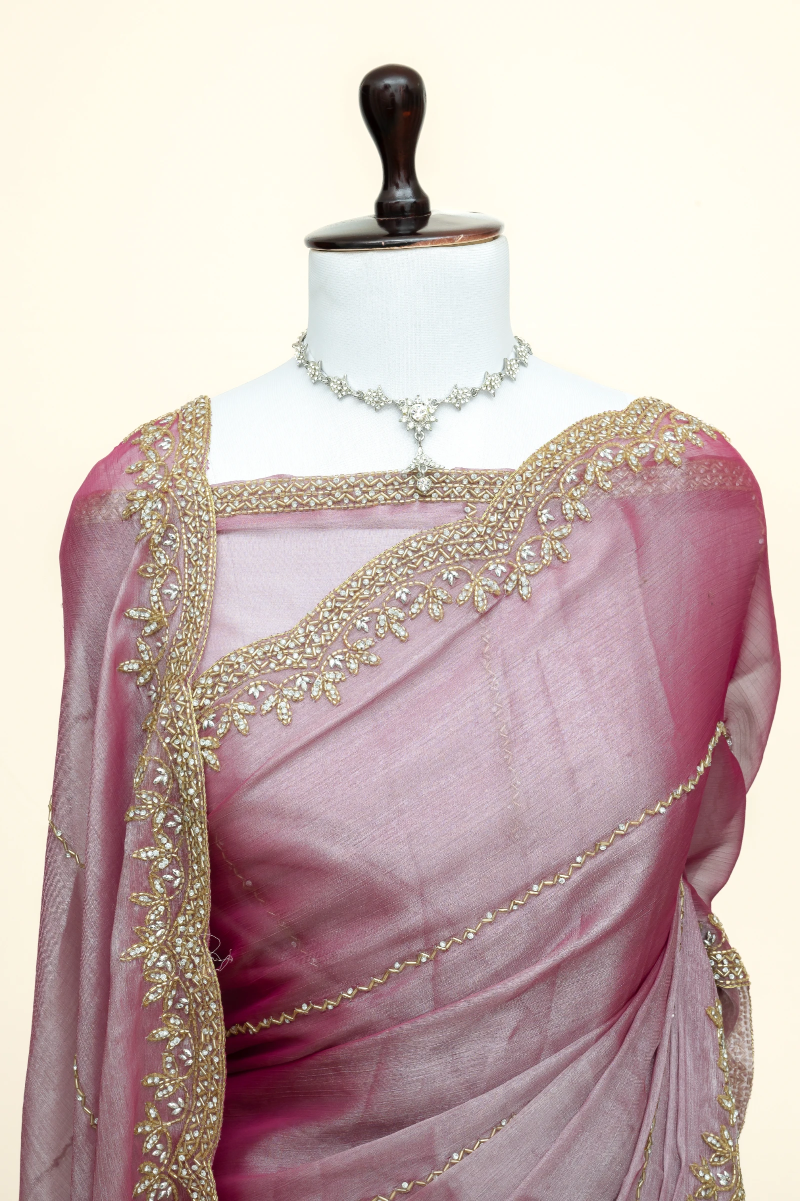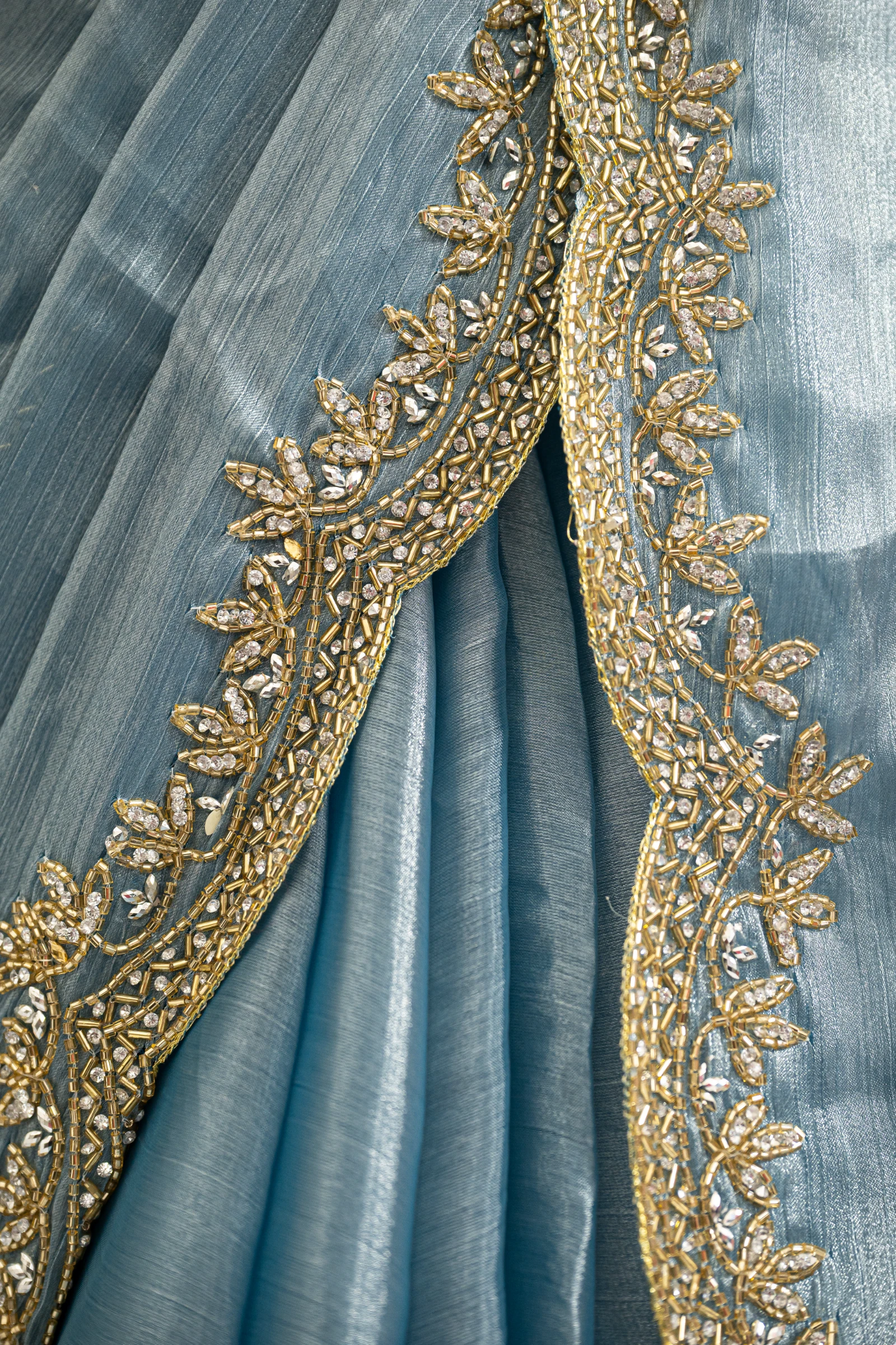 Craft Story: Rooted in Mughal heritage, Aari work is a centuries old hand embroidery technique executed with a hooked needle to form intricate chain stitches. Once reserved for royal garments of the Mughal Empire, it endures today as a timeless expression of artisanal legacy and refined luxury. Specifications: Saree Fabric Jimmy Choo Saree Colour Firozi […]