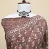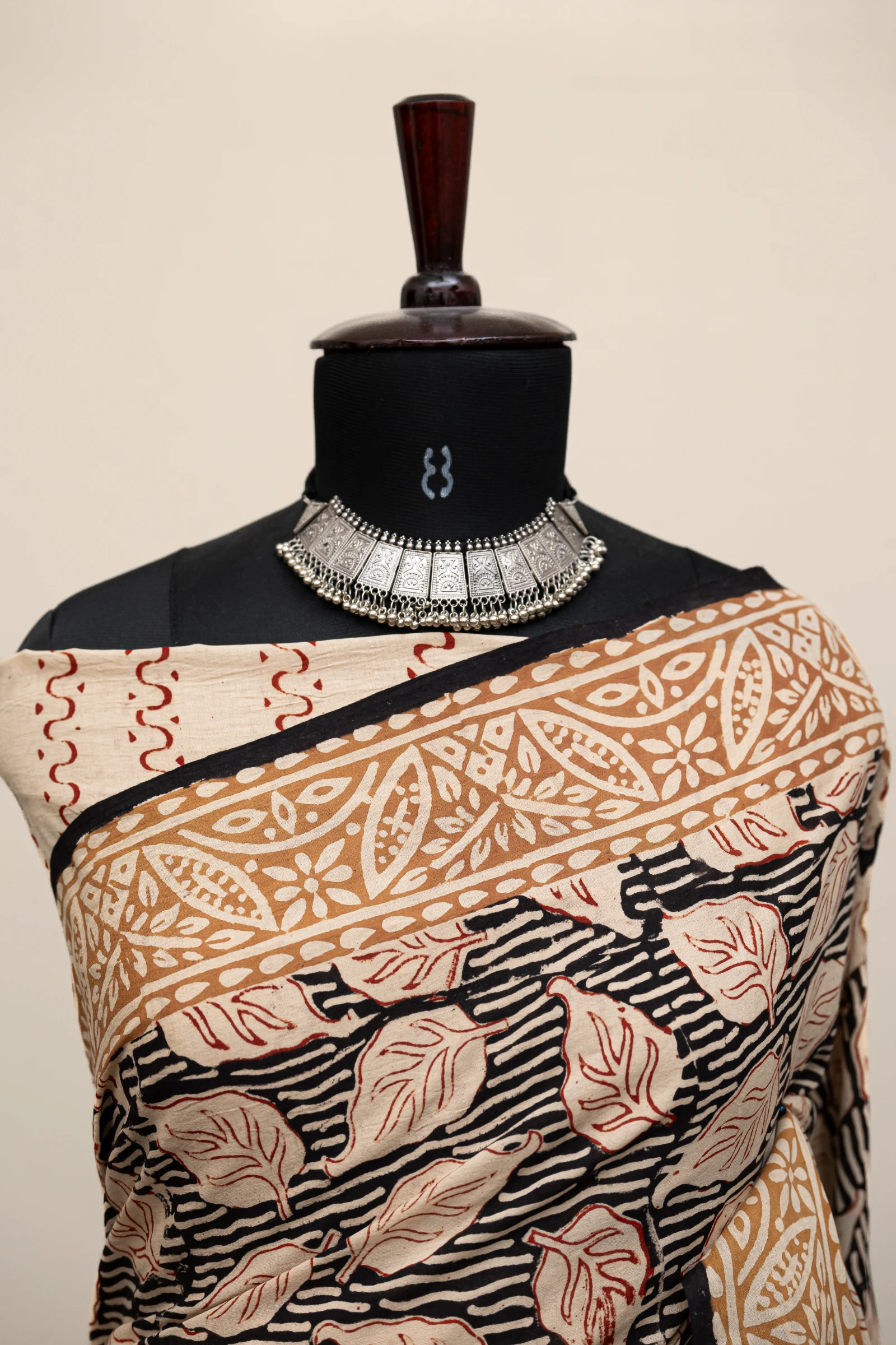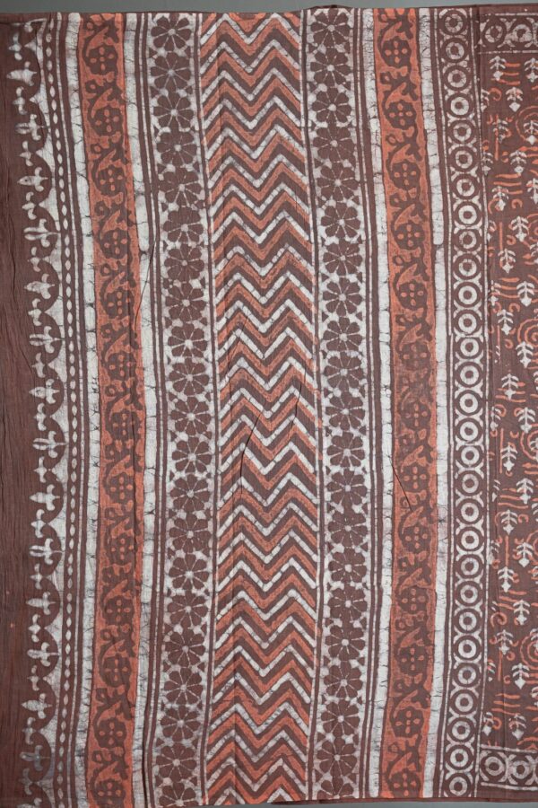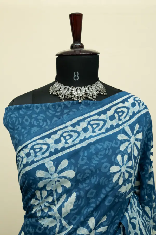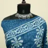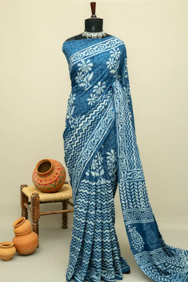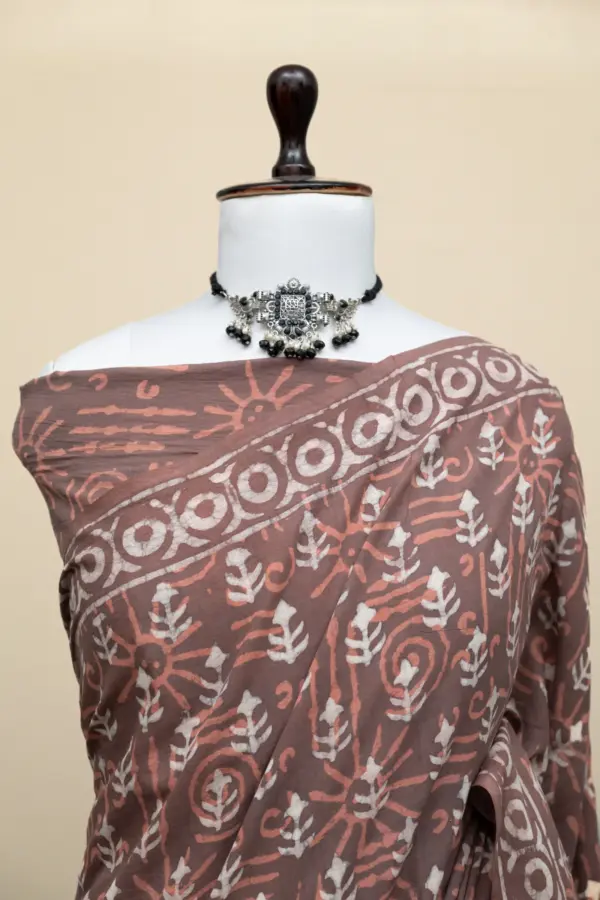 Crafted using the traditional Ajrakh hand block printing technique, this saree is dyed with natural vanaspati dyes, following a 4,500-year-old resist-dyeing tradition.