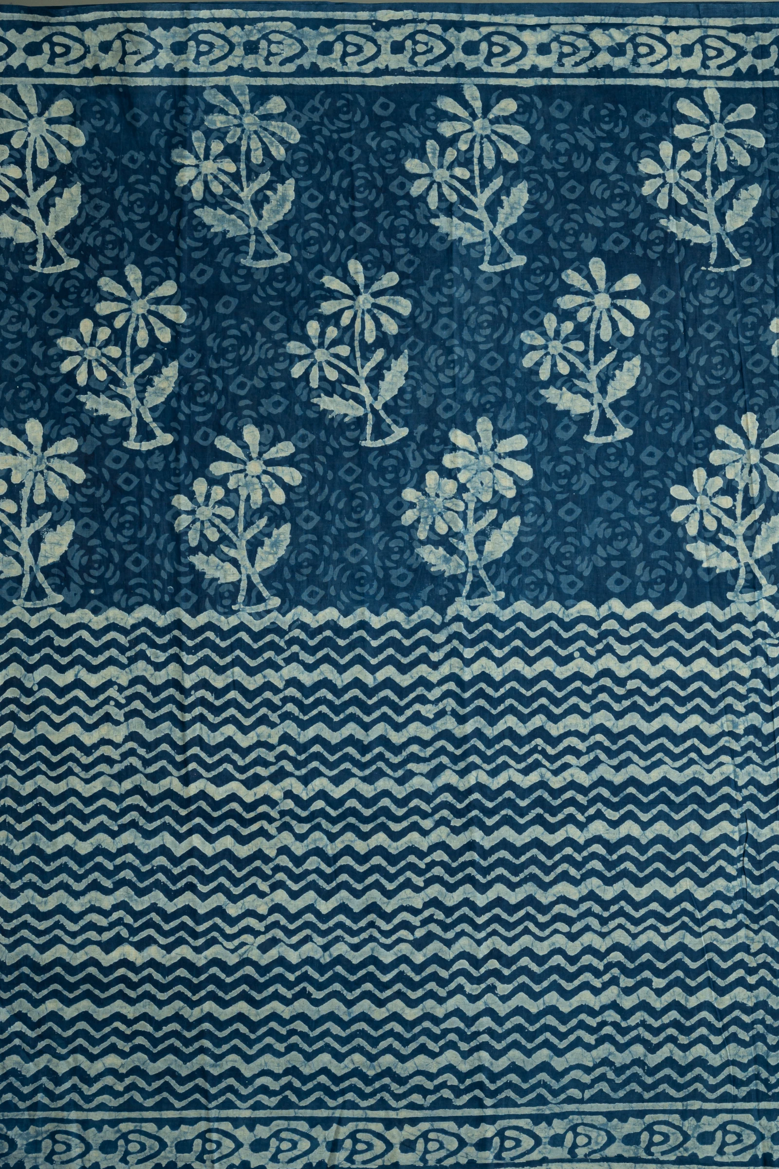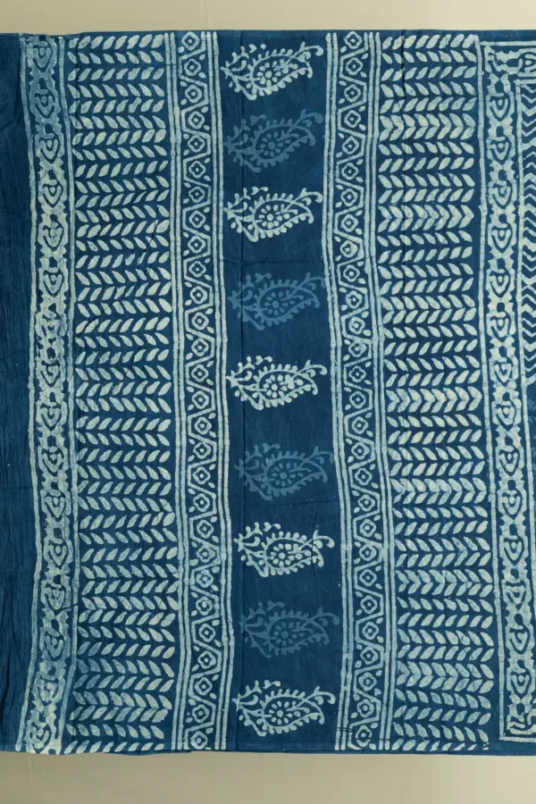 The Ajrakh process is highly intricate, involving multiple stages of precise printing and repeated dyeing to achieve its signature geometric patterns, deep hues, and exceptional depth—each piece a testament to time-honoured craftsmanship.