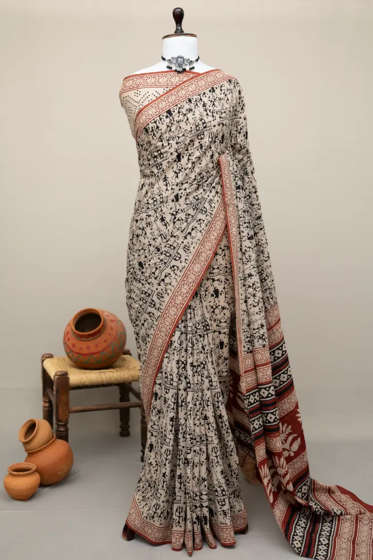 Crafted using the traditional Ajrakh hand block printing technique, this saree is dyed with natural vanaspati dyes, following a 4,500-year-old resist-dyeing tradition.