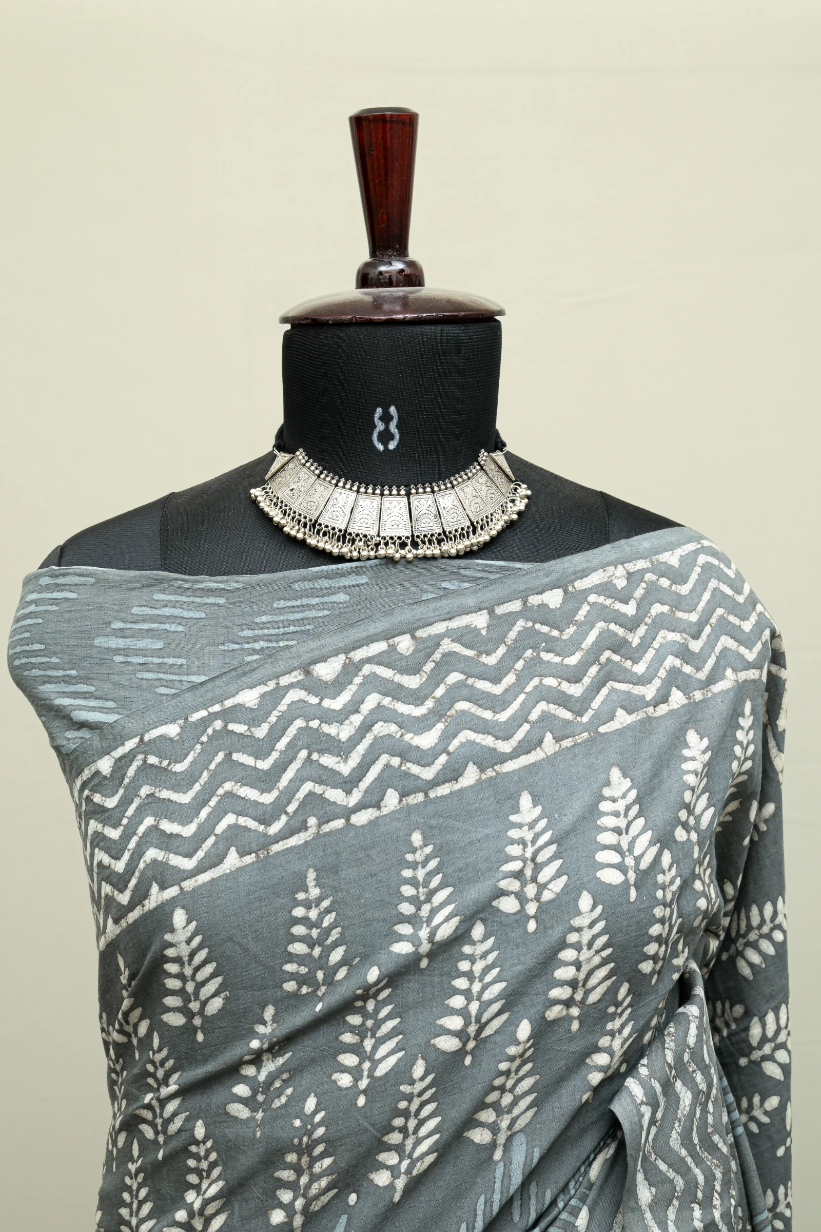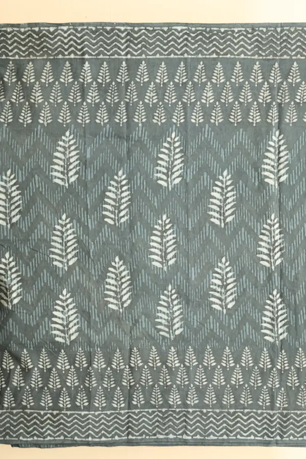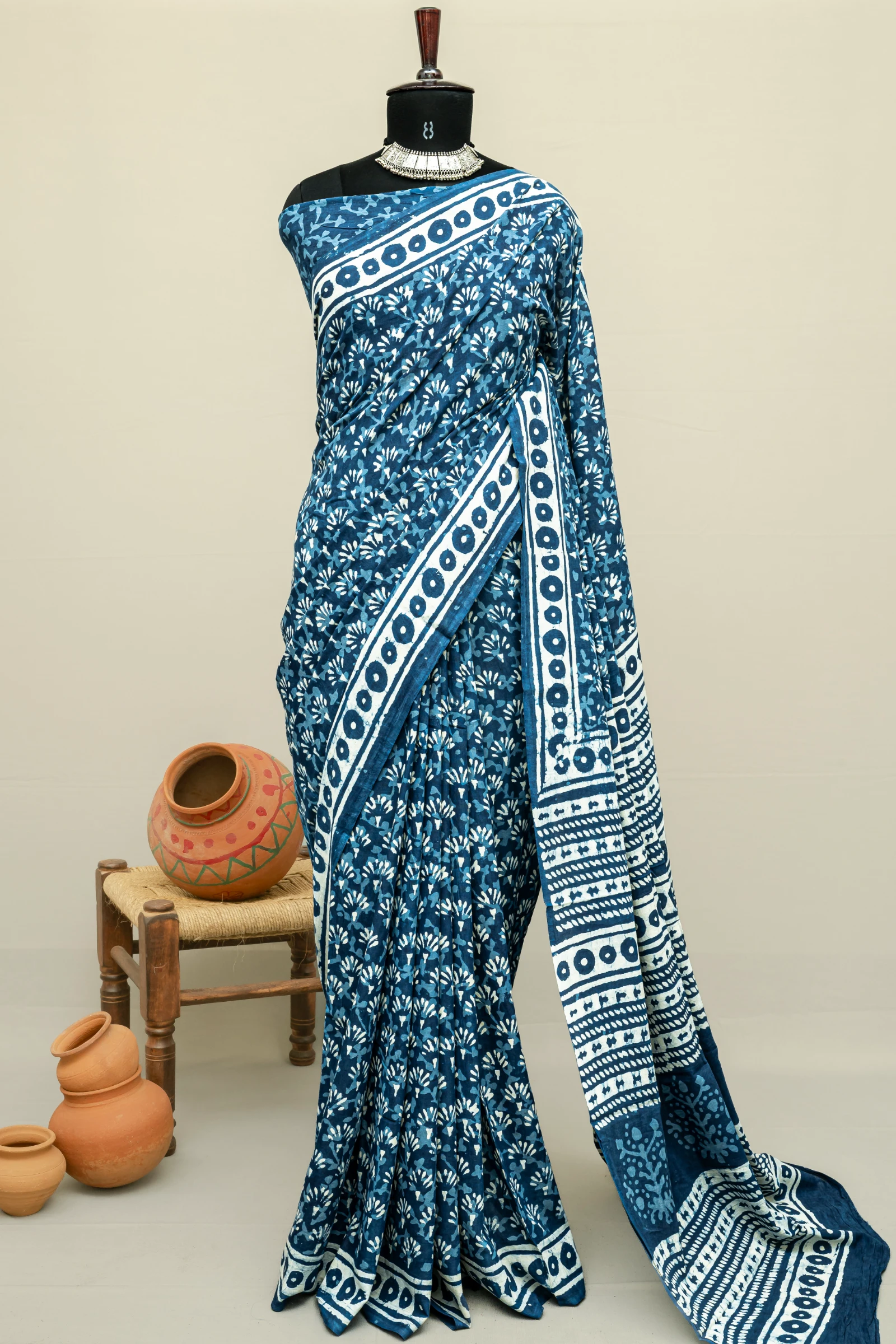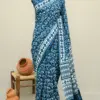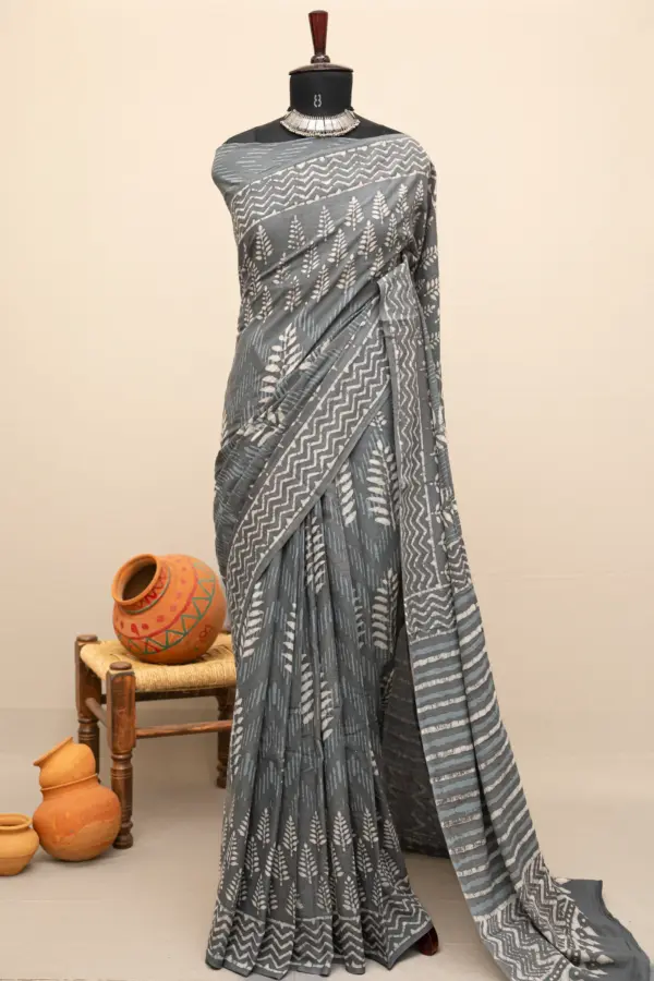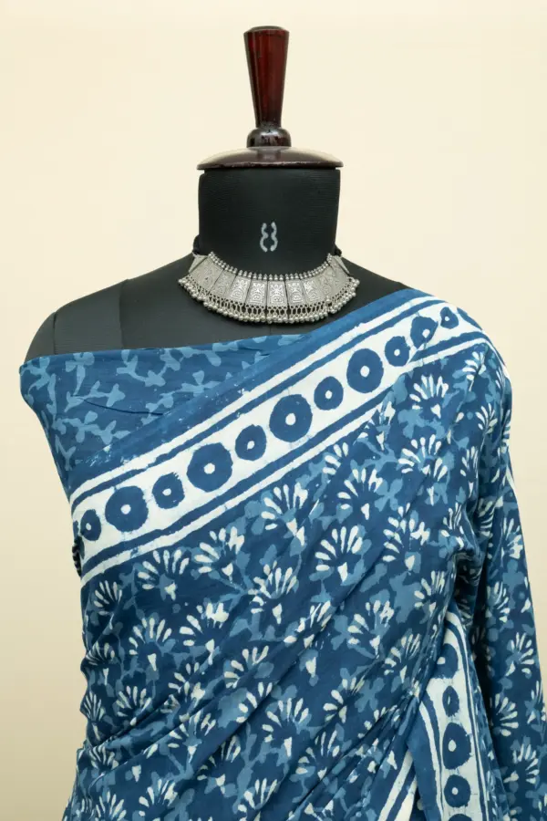 Crafted using the traditional Ajrakh hand block printing technique, this saree is dyed with natural vanaspati dyes, following a 4,500-year-old resist-dyeing tradition.