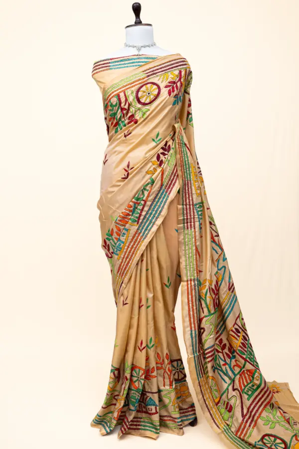 Handcrafted using Kantha, a traditional embroidery technique from West Bengal, this saree reflects a craft practiced for centuries by rural women artisans. Each stitch embodies the spirit of slow fashion, sustainability, and timeless craftsmanship.