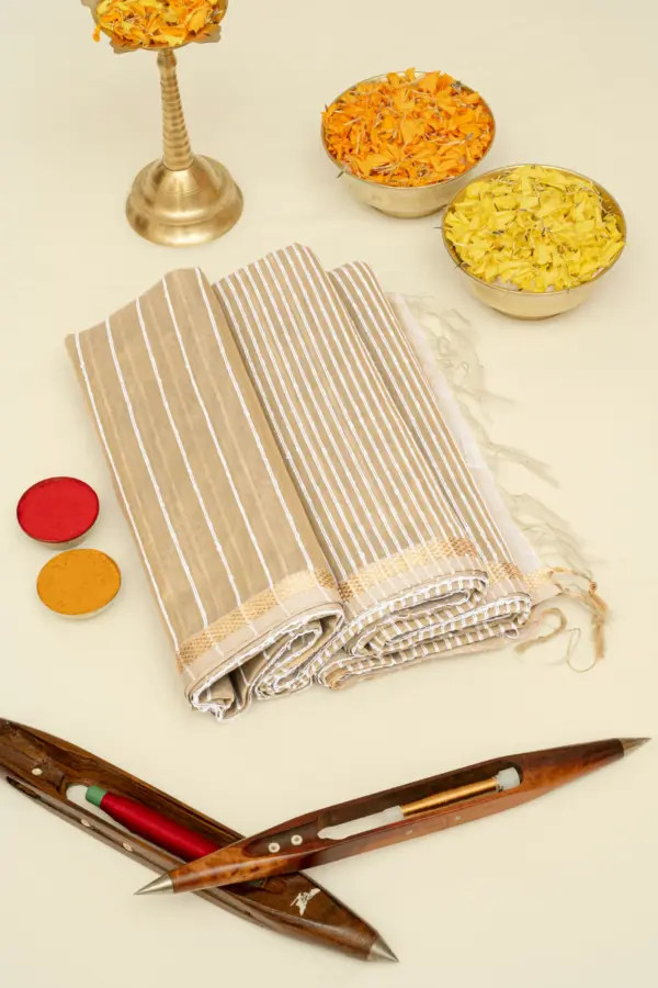Maheshwari sarees originated in Maheshwar, Madhya Pradesh during the 18th century under the queen Ahilyabai Holkar. Renowned for their lightweight feel, elegant borders, and fine silk-cotton weave, they embody royal heritage and timeless handloom sophistication.