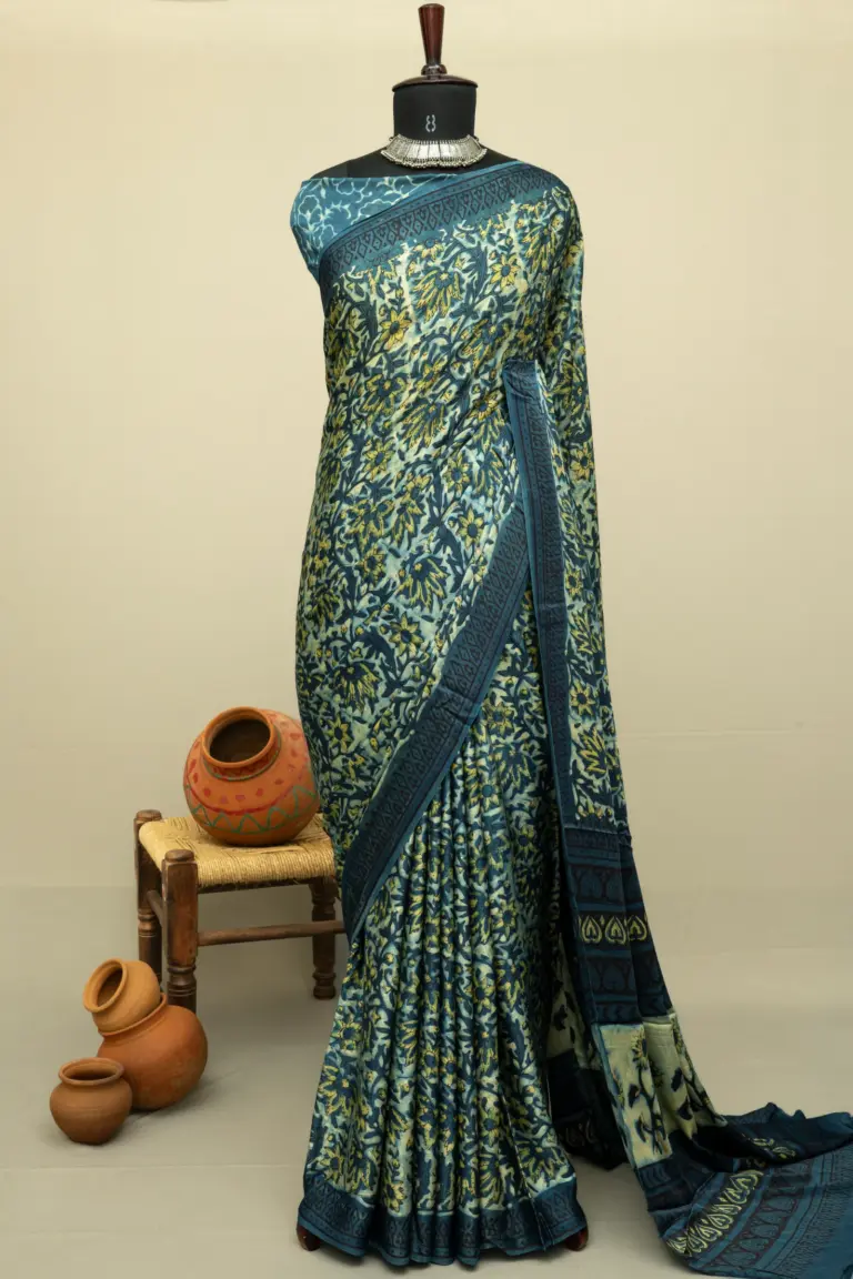 Crafted using the traditional Bagru hand block printing technique, this saree is dyed with natural colours through a rare 300-year-old mud-resist process. The art form originates from Bagru, where it has been practiced for centuries by the Chippa community—master artisans renowned for preserving this sustainable, earth-friendly textile tradition.