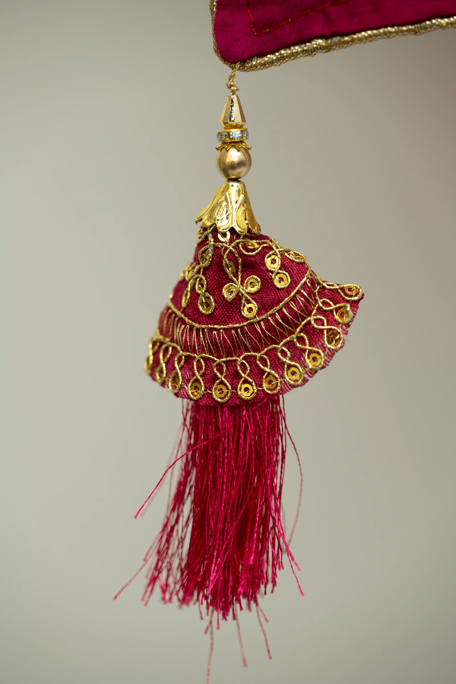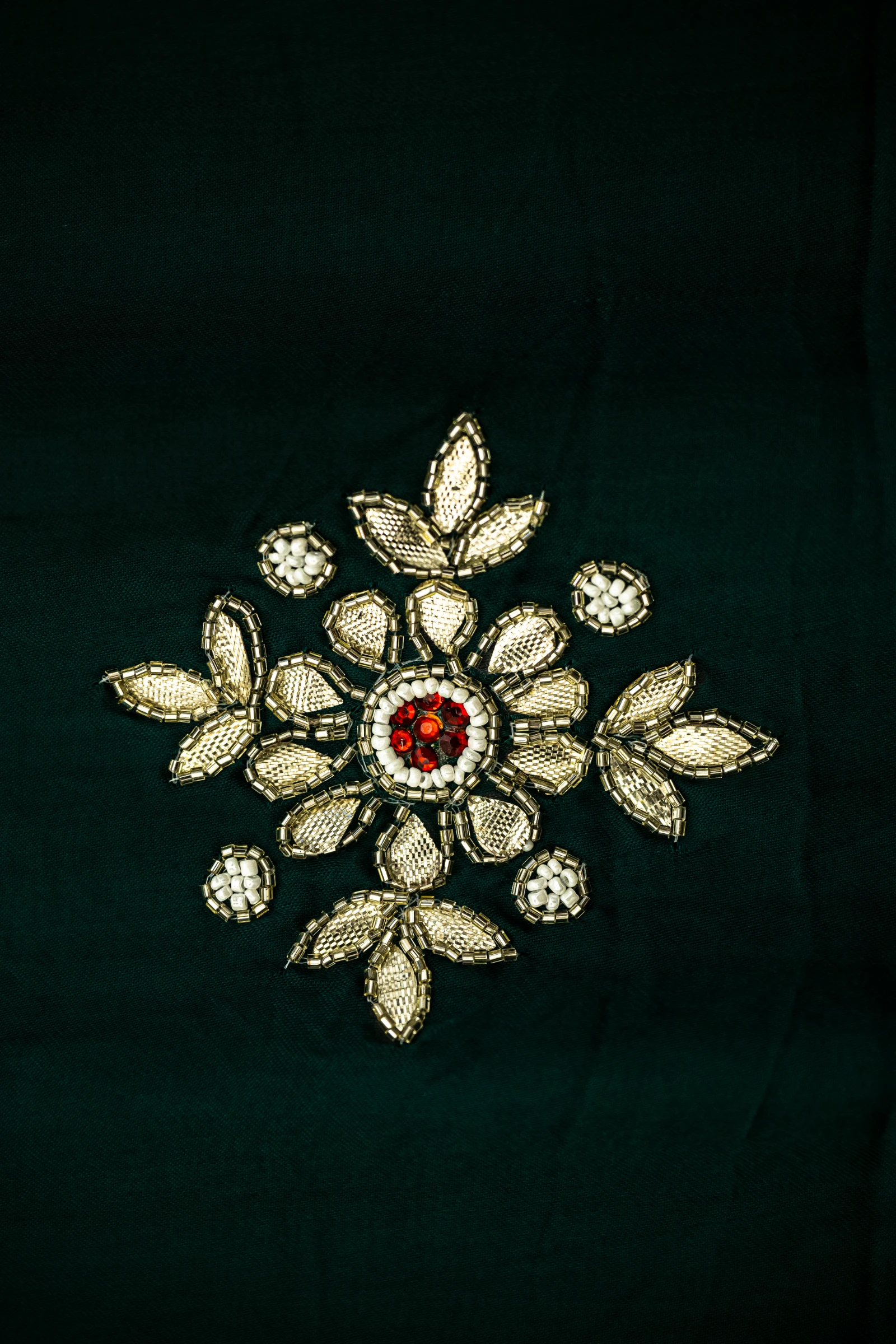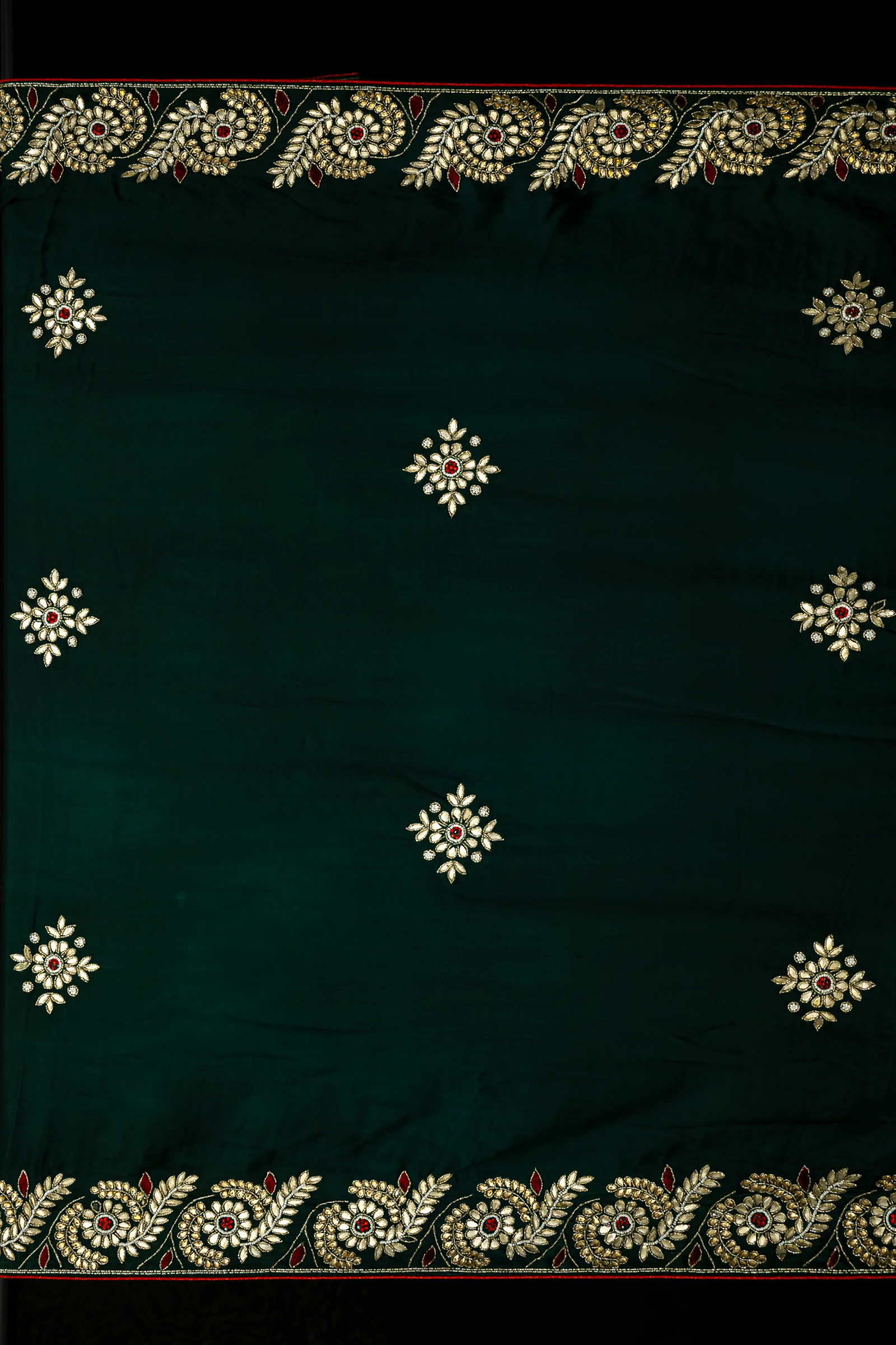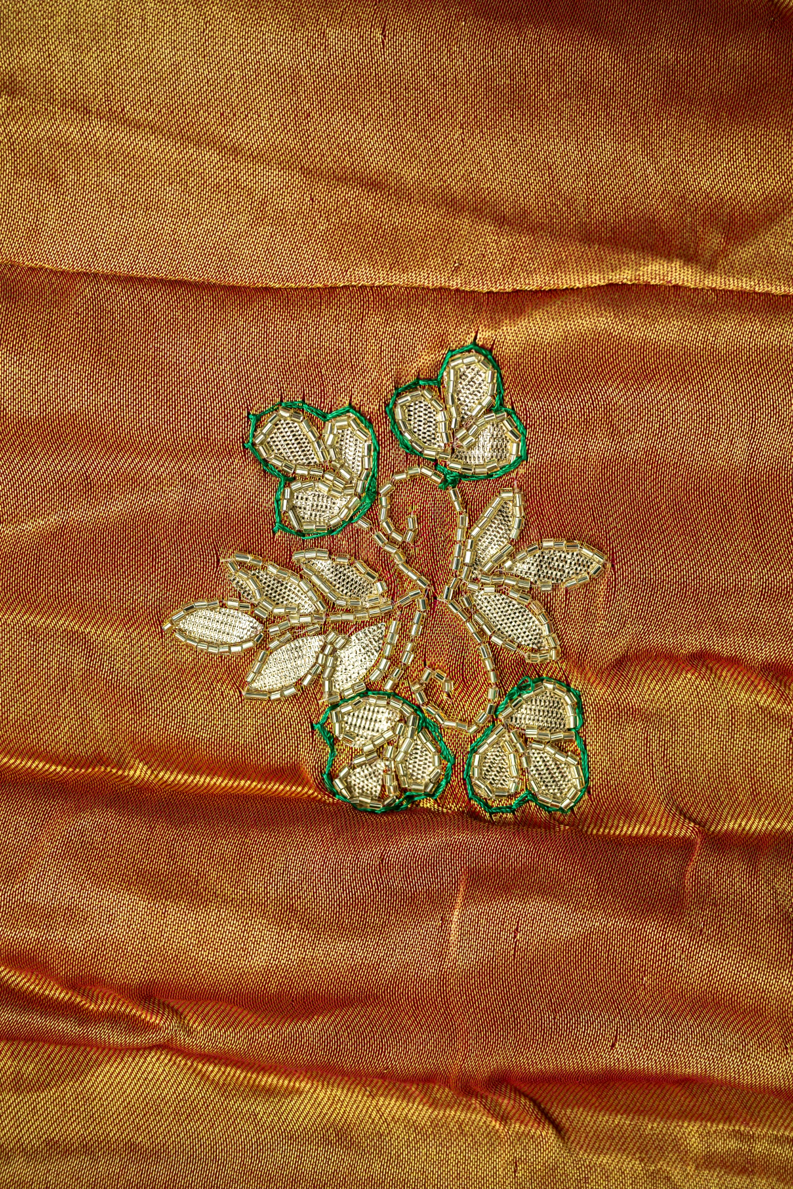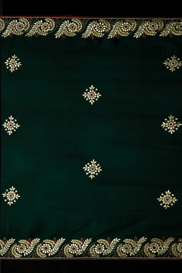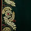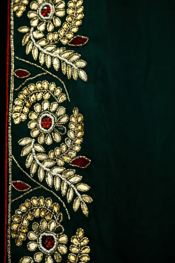 Hand embroidery done on a frame may leave subtle pin marks on the saree. Gentle variations in the pattern are inherent to handcrafted textiles and stand as a testament to true artisan craftsmanship.