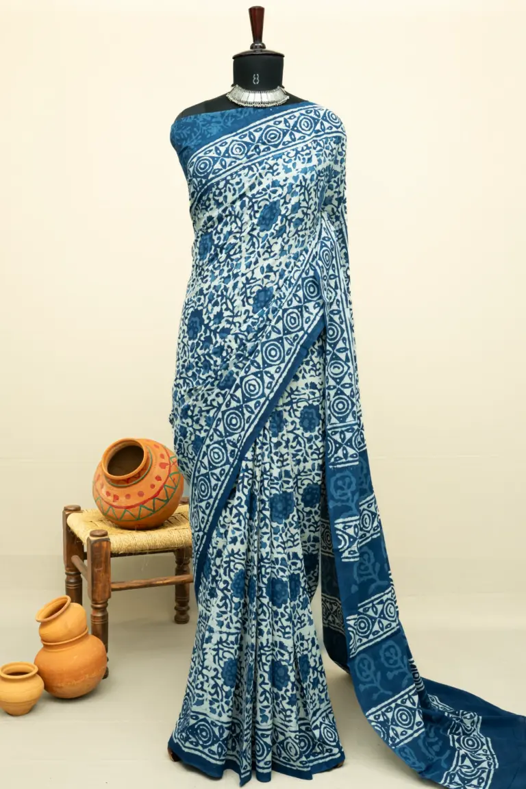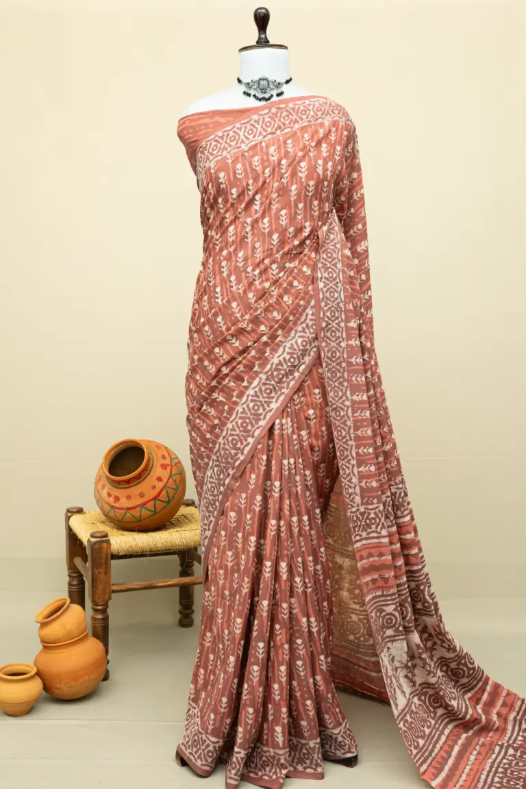 Crafted using the traditional Ajrakh hand block printing technique, this saree is dyed with natural vanaspati dyes, following a 4,500-year-old resist-dyeing tradition.