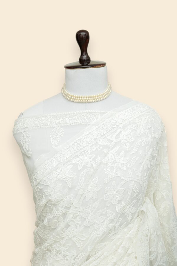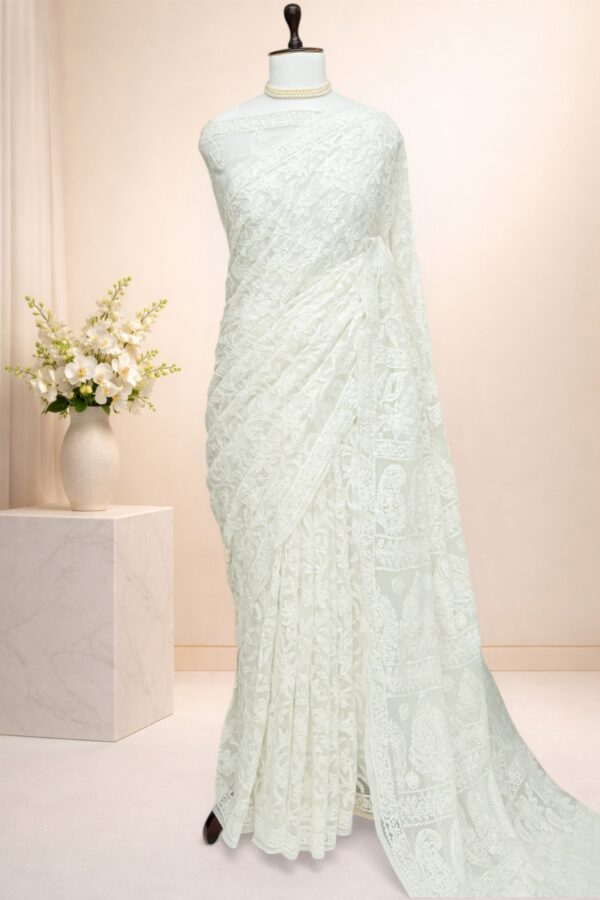 • Hand embroidery done on a frame may leave subtle pin marks on the saree. Gentle variations in the pattern are inherent to handcrafted textiles and stand as a testament to true artisan craftsmanship.